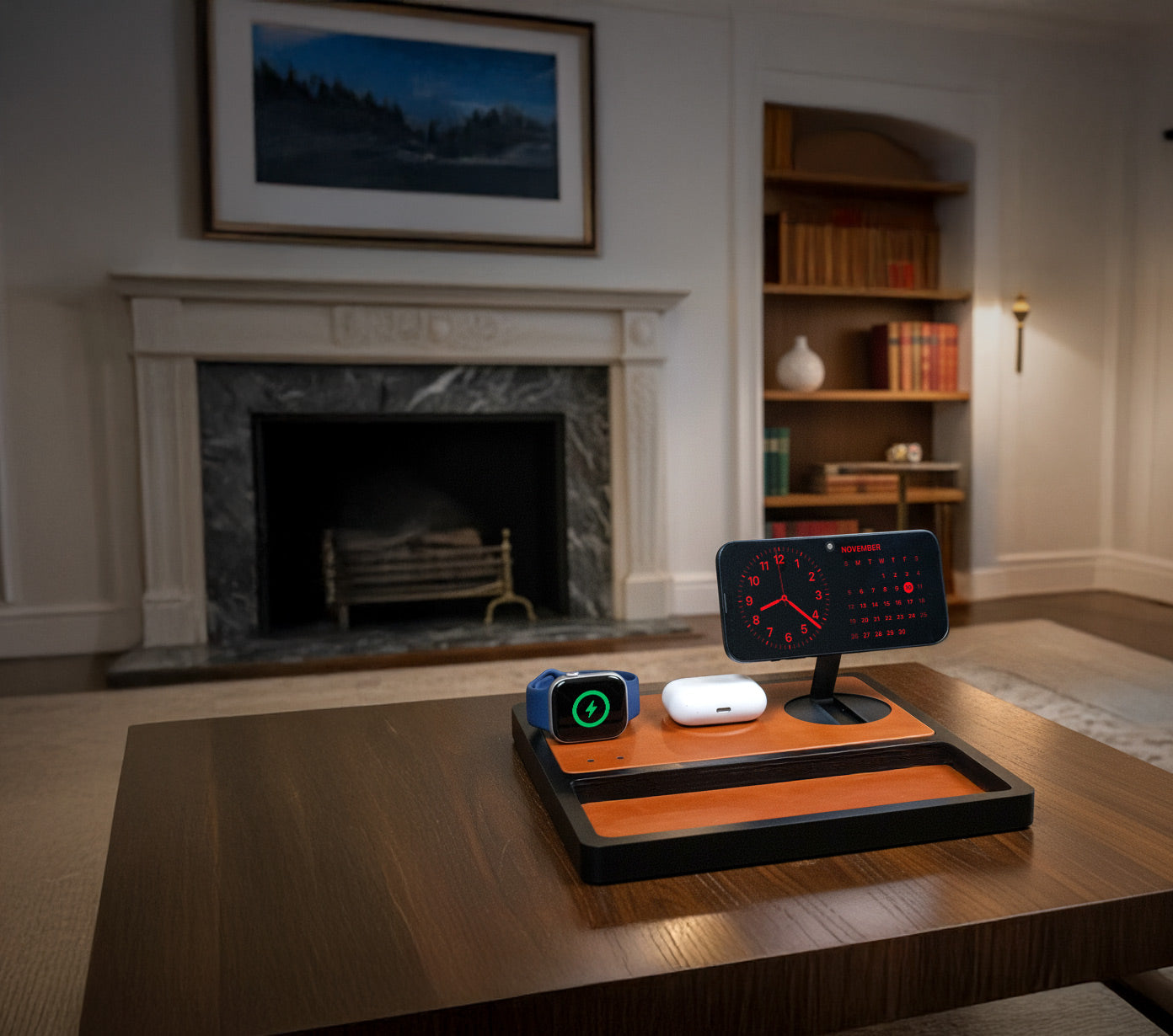 • A MagSafe power bank charging an iPhone next to an Apple Watch on a nightstand.