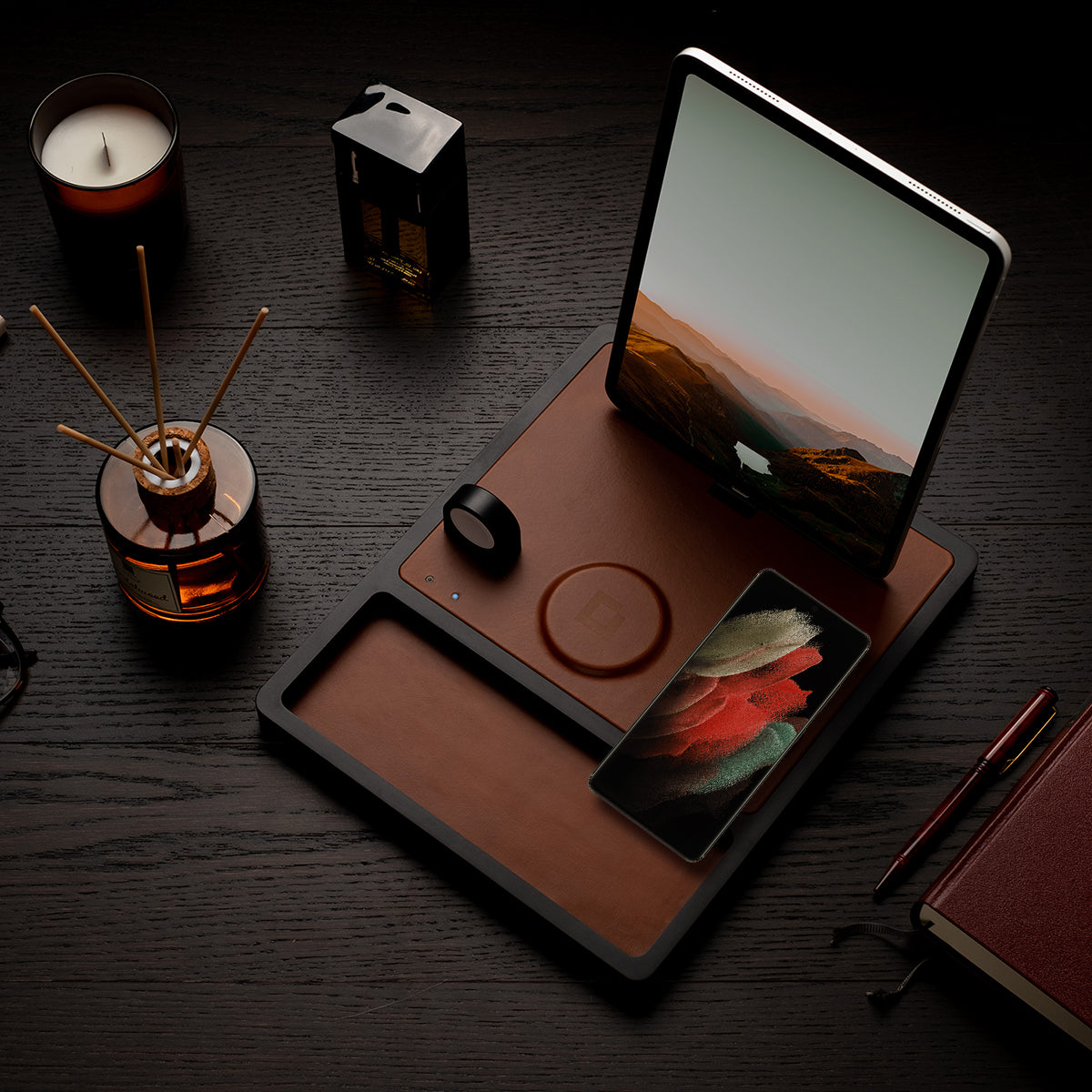 With the Samsung Wireless Charging Station, you can charge your phone and other compatible devices without plugging in a single cable. Simply place your device on the charging pad, and watch the magic happen. Crafted with full-grain leather & wood.