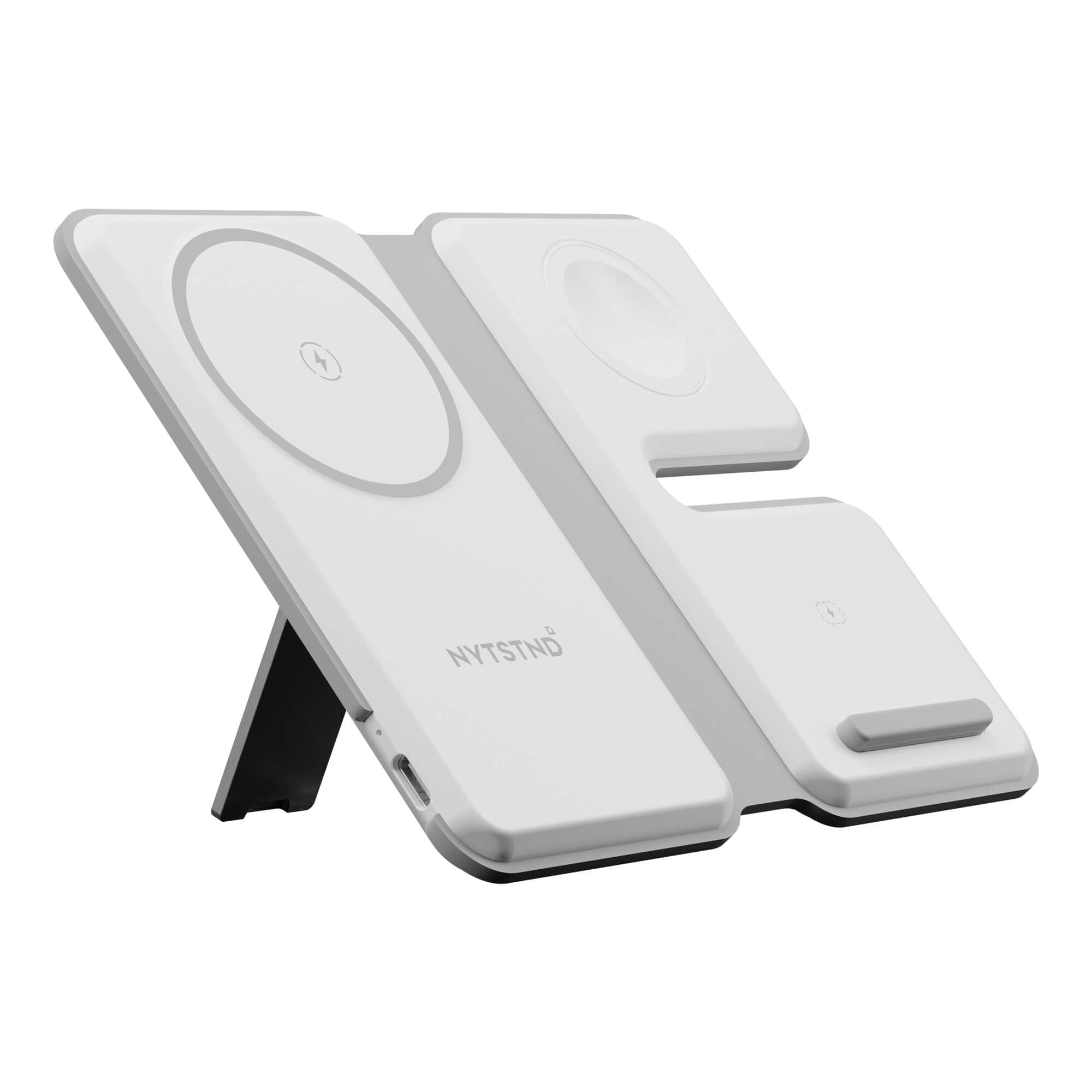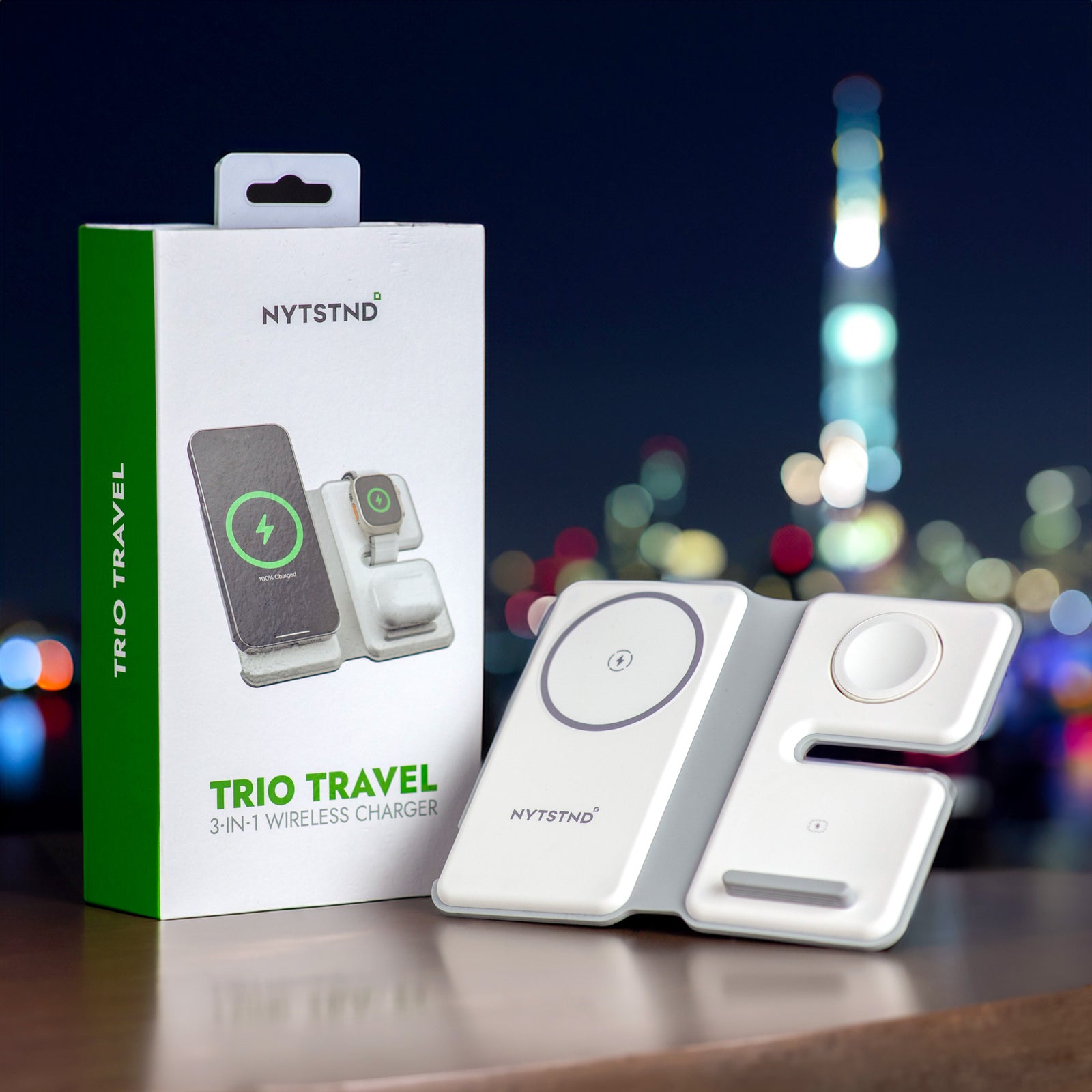With TRIO TRAVEL, experience the freedom of wireless charging on the go. This compact, foldable device integrates a MagSafe charger, an Apple Watch charger, and a wireless charging pad for your AirPods or other Qi-compatible devices. Designed for convenience, it unfolds in seconds and begins powering your devices, no matter where your adventures take you.